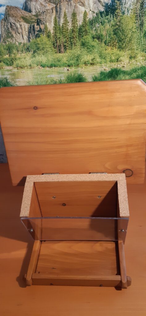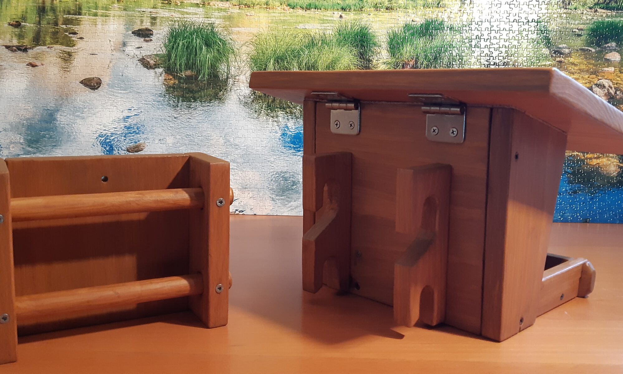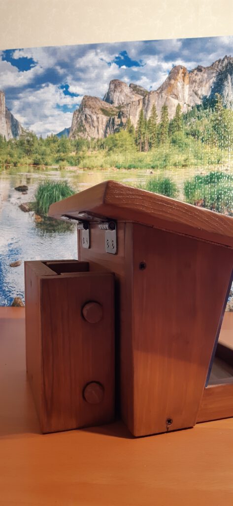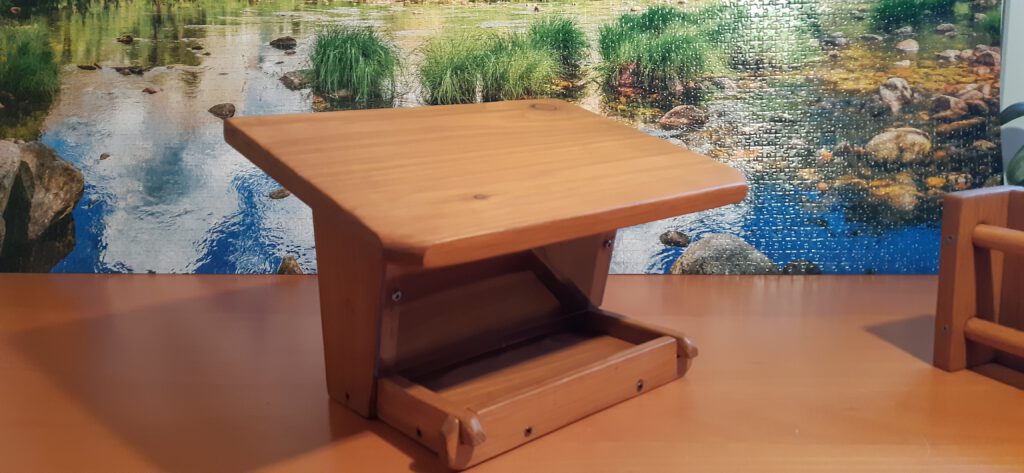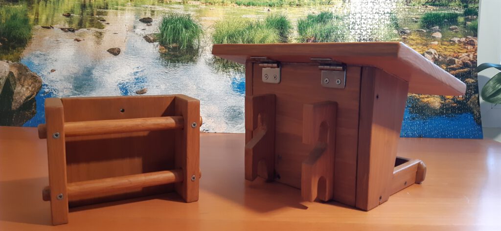 Dieser hochwertige und unter ökologischen Gesichtspunkten gefertigte Vogelfutterspender mit schöner Haptik entsteht in Handarbeit. Verwendet wird Lärchenholz aus der Region Celle und Umgebung aus zertifizierten Beständen. Das Holz wurde im Sommer 2024 als Schnittholz vom Holzhändler gekauft und ca. 1,5 Jahre auf unserem Hof trocken gelagert, bevor dann die Holzteile auf Dicke gehobelt und auf Maß gesägt wurden. Es sind alle Schraubenlöcher vorgebohrt und sämtliche Kanten gerundet. Vor dem Auftrag des Holzschutz wurde bis auf 180´er Körnung sorgfältig geschliffen. Auf Langlebigkeit habe ich besonders großen Wert gelegt, deshalb habe ich diese Kleinserie (10 Stück) mit Remmers Eco-Holzgrundierung (2x) grundiert und mit Remmers Eco-Dauerschutzlasur (2x) lasiert. Bei der Lasur handelt es sich um eine Öl-Lasur (Dünnschichtlasur), die tief ins Holz eindringt und keine „Lasurschicht“ bildet, die im Laufe der Jahre abblättern kann. Den Wandhalter habe ich auf der Ober- und Unterseite, sowie an den Stabenden zusätzlich mit Osmo-Hirnholzschutz behandelt. Gefertigt wird in Handarbeit mit Profi-Werkzeugen von Festool, Felder, Mirka, Pégas, etc.