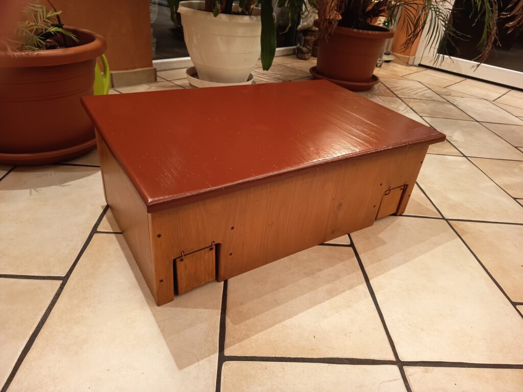 Dieses hochwertige und ökologisch gefertigte Igelfutterhaus entsteht in aufwändiger Handarbeit. Beim Bau wurde Lärchenholz aus der Region Celle und Umgebung aus zertifizierten Beständen verwendet. Das Holz wurde im Sommer 2024 als Schnittholz vom Holzhändler gekauft und ca. 1,5 Jahre auf unserem Hof trocken gelagert, bevor dann die Holzteile auf Dicke gehobelt und auf Maß gesägt wurden. Es sind alle Schraubenlöcher vorgebohrt und sämtliche Kanten gerundet. Vor dem Auftrag des Holzschutz wurde bis auf 180´er Körnung sorgfältig geschliffen. Auf Langlebigkeit habe ich bei Werkfuchs besonders großen Wert gelegt, deshalb wurde der Korpus dieses Futterhauses mit Remmers Eco-Holzgrundierung (2x) grundiert und mit Remmers Eco-Dauerschutzlasur (2x) lasiert. Bei der Lasur handelt es sich um eine Öl-Lasur (Dünnschichtlasur), die tief ins Holz eindringt und keine „Lasurschicht“ bildet, die im Laufe der Jahre abblättern kann. Das Dach habe ich in Oxidrot mit Bootslack lackiert und anschließend mit einem elastischen Klarlack (Asuso Bootslack klar) versiegelt.